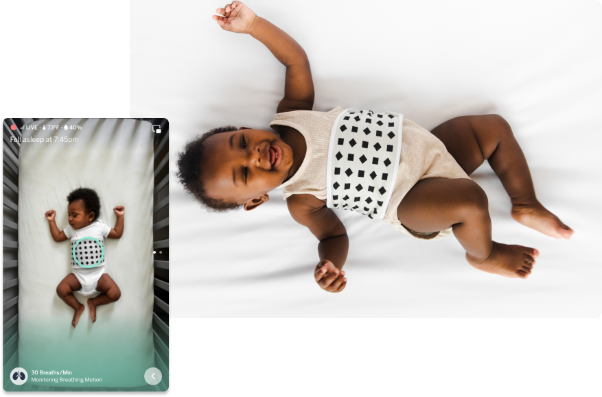 Nanit houdt de ademhalingsbewegingen van je baby in de gaten via het patroon op het katoenen ademhalingsbandje. Volg het aantal ademhalingen per minuut, ontvang meldingen als je baby jou nodig heeft, en bekijk dagelijkse, wekelijkse en maandelijkse gemiddelden. Volledig radar- en sensorvrij voor een veilige slaapomgeving.